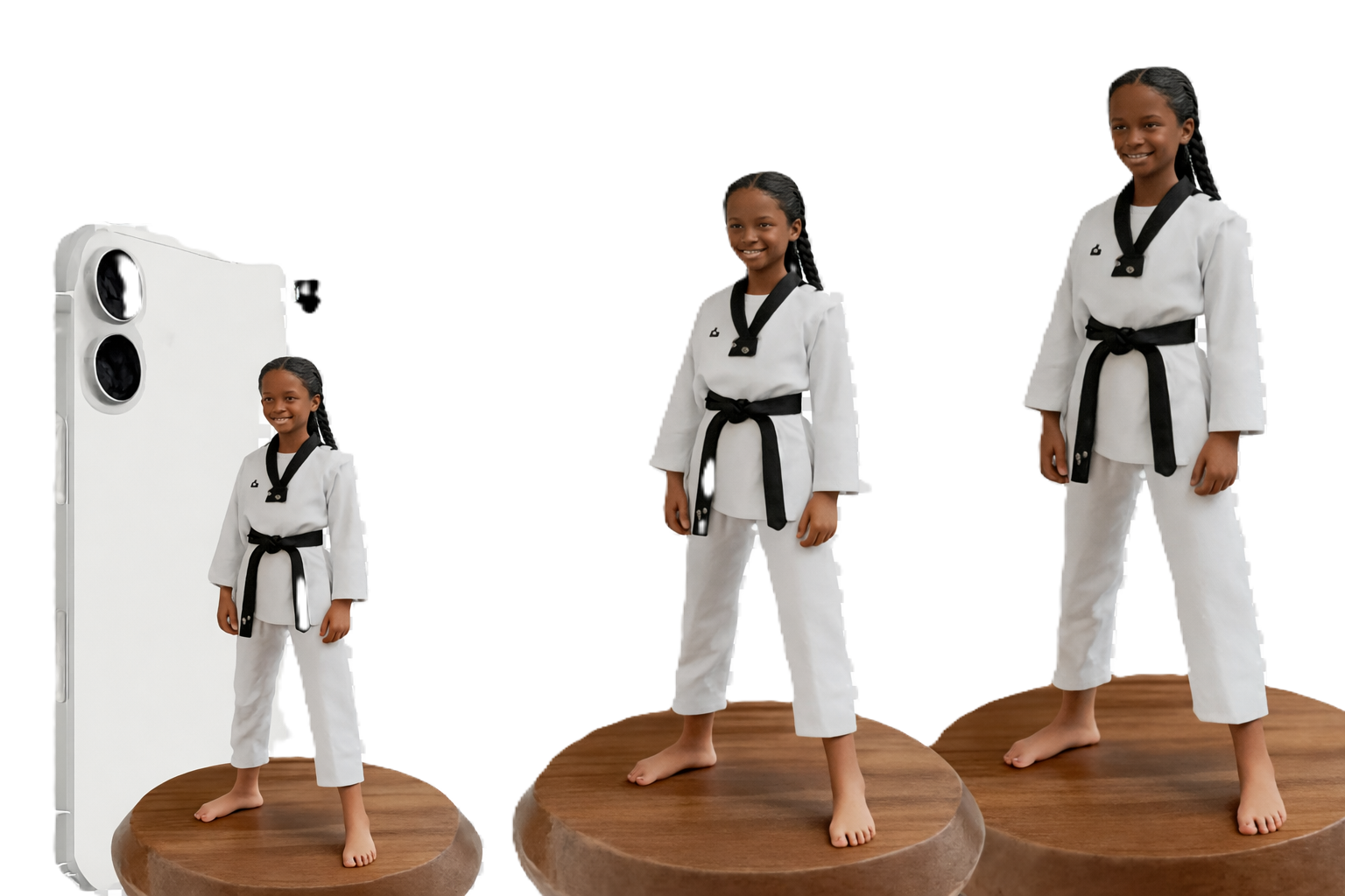 During your session, our advanced 3D scanner uses six cameras to capture 180 images in just 20 seconds. These images are carefully processed into a detailed 3D model in about 15 minutes, preserving every angle, detail, and expression after you strike your unique pose.